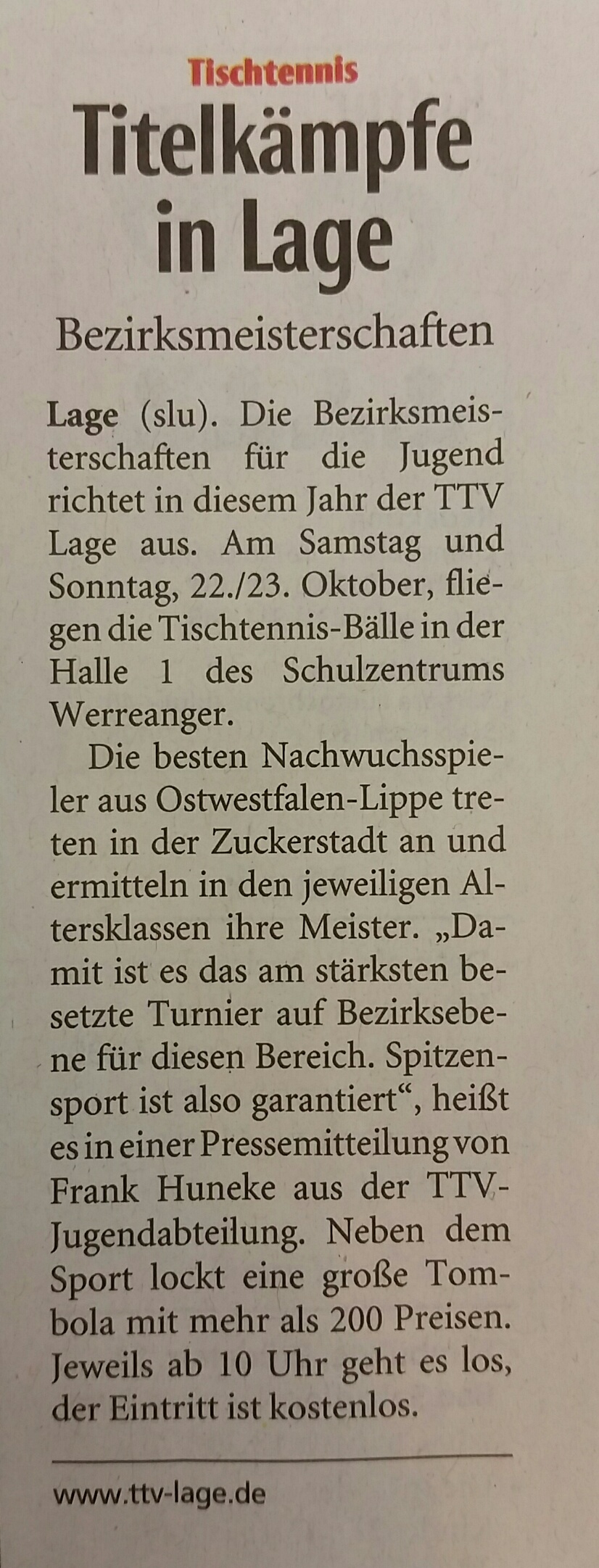 Der TTV Lage richtet die ostwestfälischen Bezirksmeisterschaften aus