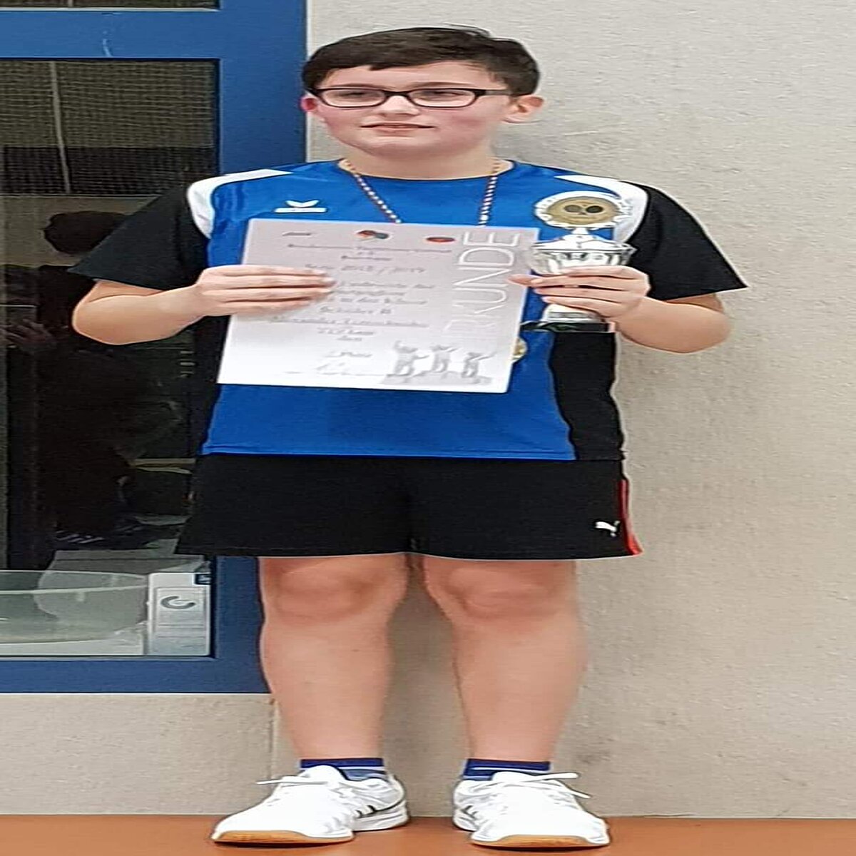 Musste sich Alex im Gruppenspiel noch gegen den Topfavoriten Oliver Sieger aus Hiddesen-Pivitsheide im fünften Satz geschlagen geben, drehte er im Endspiel nach einem 0:2 Rückstand das spannende Spiel und siegte sensationell.
