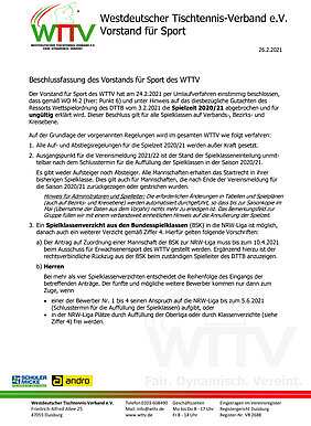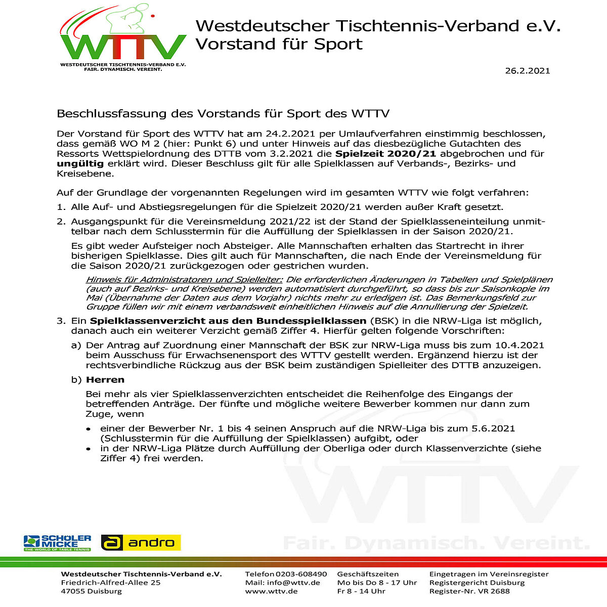 Der Vorstand für Sport des WTTV hat am 24.2.2021 per Umlaufverfahren einstimmig beschlossen, dass gemäß WO M 2 und unter Hinweis auf das diesbezügliche Gutachten des Ressorts Wettspielordnung des DTTB vom 3.2.2021 die Spielzeit 2020/21 abgebrochen und für ungültig erklärt wird. Dieser Beschluss gilt für alle Spielklassen auf Verbands-, Bezirks- und Kreisebene.