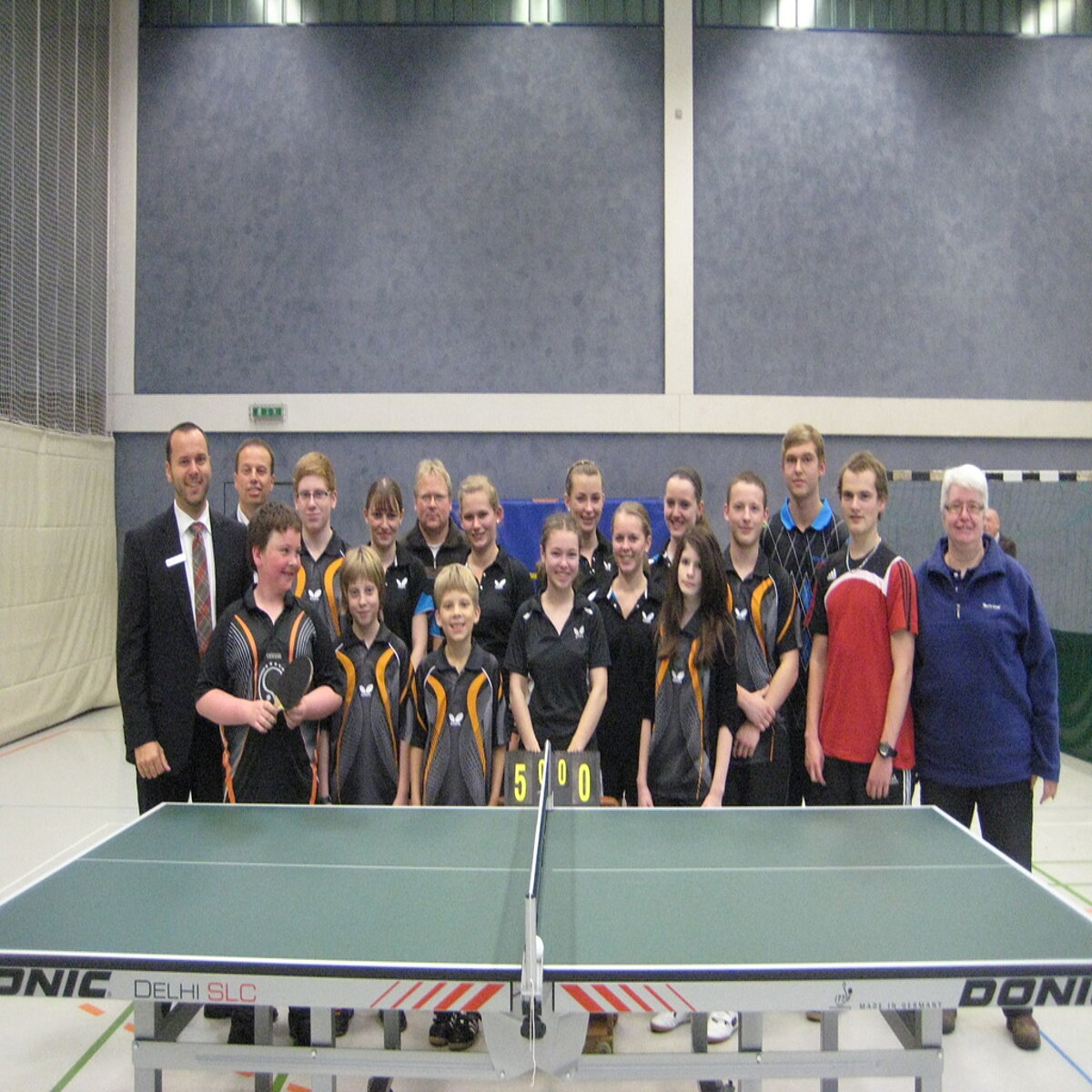 Einen überraschenden Anruf der Sparkasse Paderborn-Detmold erhielt unser 1. Vorsitzender Thomas Hattermann vom Filialleiter Sebastian Fellmer in Lage. Das Losglück hatte den TTV Lage voll erwischt und ein Hauptpreis im Wert von 1.000 € ging nach Lage. So konnten mit Hilfe der Sparkasse 2 neue TT-Platten für den Jugendbetrieb in der TH Werreanger angeschafft werden. Herr Fellmer übergab den Preis persönlich und ließ es sich nicht nehmen, einige rasante Ballwechsel gegen unseren 1. Vorsitzenden zu spielen. Auf dem Foto sind außerdem die Vorstandsmitglieder Gabi Weber und Uwe Schnelle sowie der Mädchen-Betreuer Werner Richter zu sehen. Jetzt können die vielen Schüler und Jugendlichen weiter unter professionellen Bedingungen trainieren.
