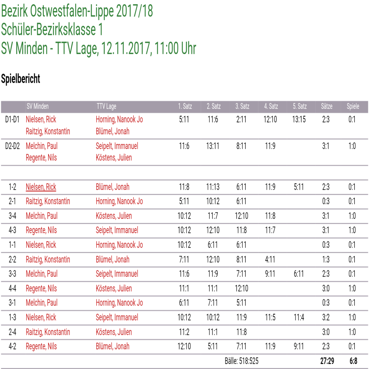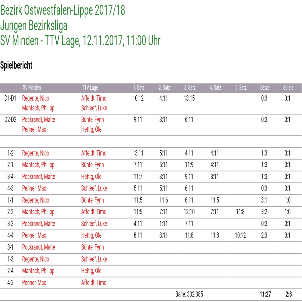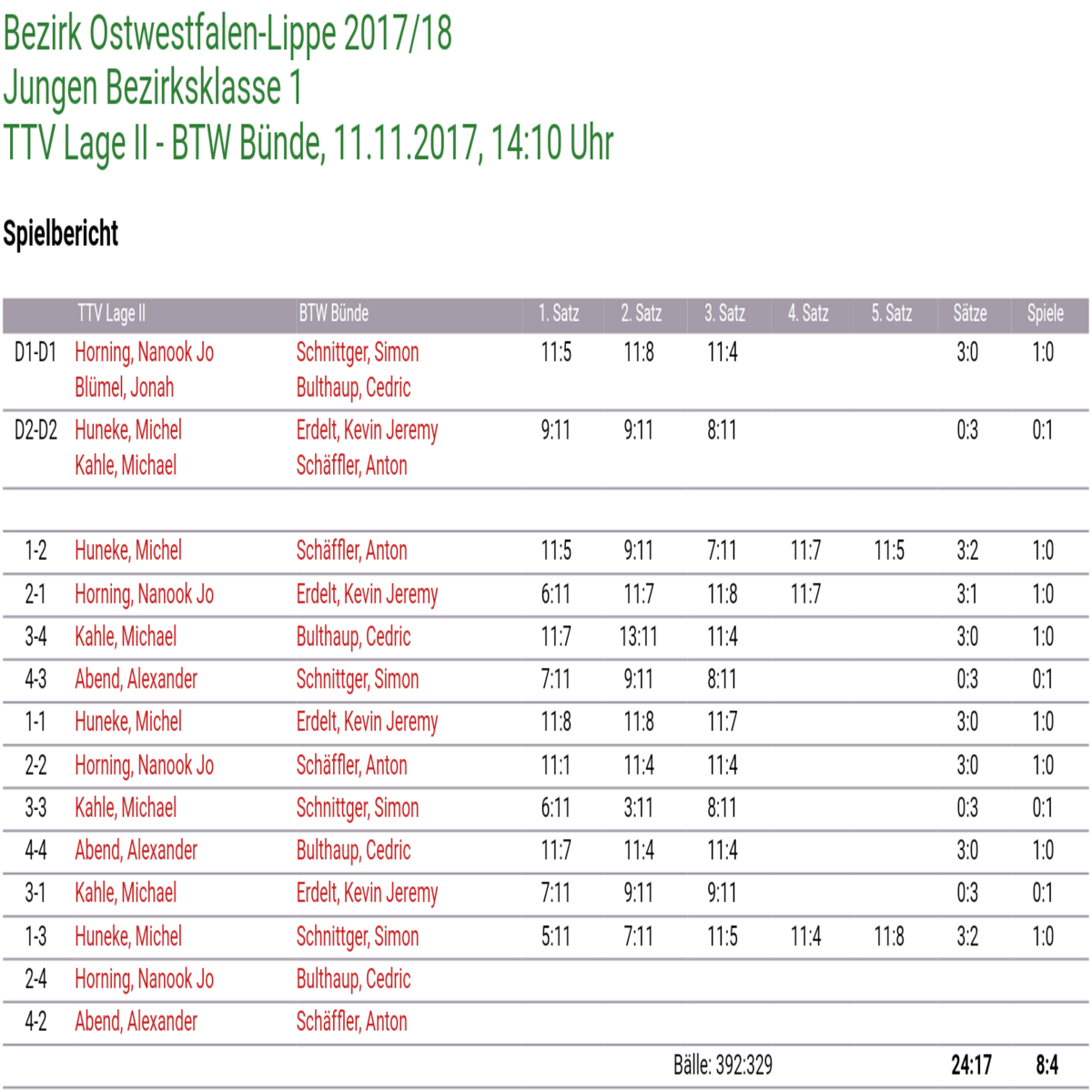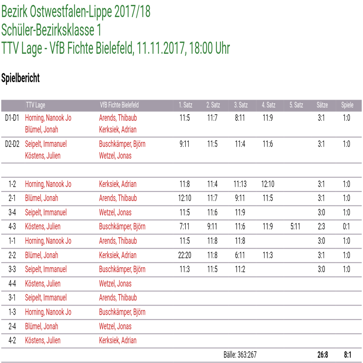 Bereits am Donnerstag konnte die 1. Jungen beim Heimspiel gegen Heepen, dank viel Kampf und 4 gewonnen 5-Satzspielen, mit 8:5 vorlegen.