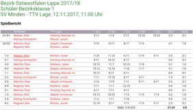 Schlussendlich durften 1. Jungen und 1. Schüler heute parallel in Minden zum 2. Mal zum Schläger greifen. Gemeinsam unterstütze man sich und bezwang den Gastgeber mit 8:2 (Jungen) und 8:6 (Schüler). Besonders lobenswert ist die Leistung von Nanook und Jonah, die beide nach 2 Spielen am Samstag ihre 3 Einzel und das gemeinsame Doppel gewinnen konnten.