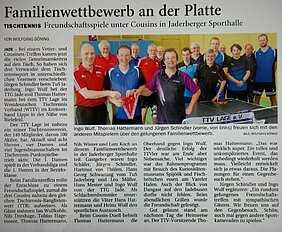 Nach dieser Stärkung kam es dann zum mit Spannung erwarteten sportlichen Vergleich gegen die gemischte Mannschaft des TTG Jade und TuS Jaderberg. Selbst die örtliche Presse ließ es sich nicht nehmen und erschien zum Fototermin. Nach über 3 Stunden stand es dann 13:3 für unsere Jungs. Es wurden alle Spiele durchgespielt und es kam zu einigen hochklassigen Ballwechseln. Besonders im oberen Paarkreuz machte sich bei Jan und Nils die lange Hinfahrt bemerkbar…